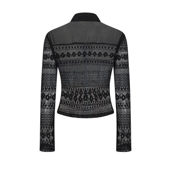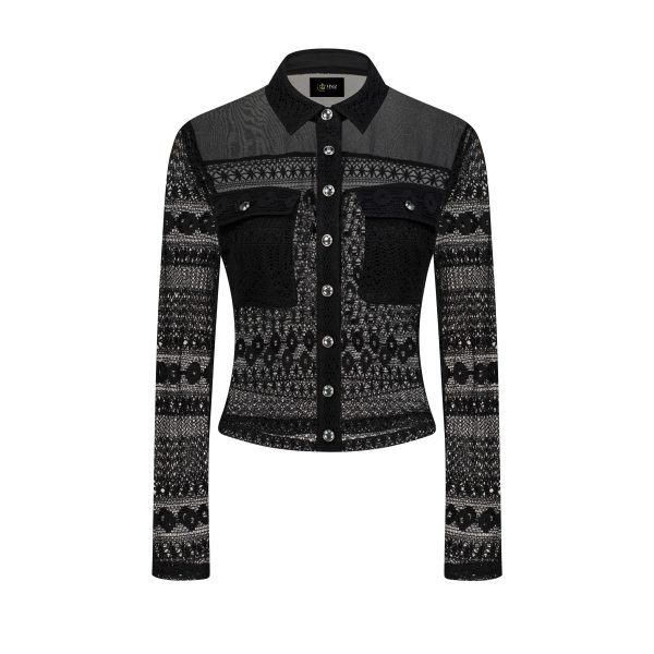 - A captivating fusion of elegance and edge, the Shadow Lace Blouse features intricate lace patterns with sheer detailing for a bold yet sophisticated look. Designed with structured pockets and shimmering buttons, this blouse seamlessly blends delicate craftsmanship with modern styling.